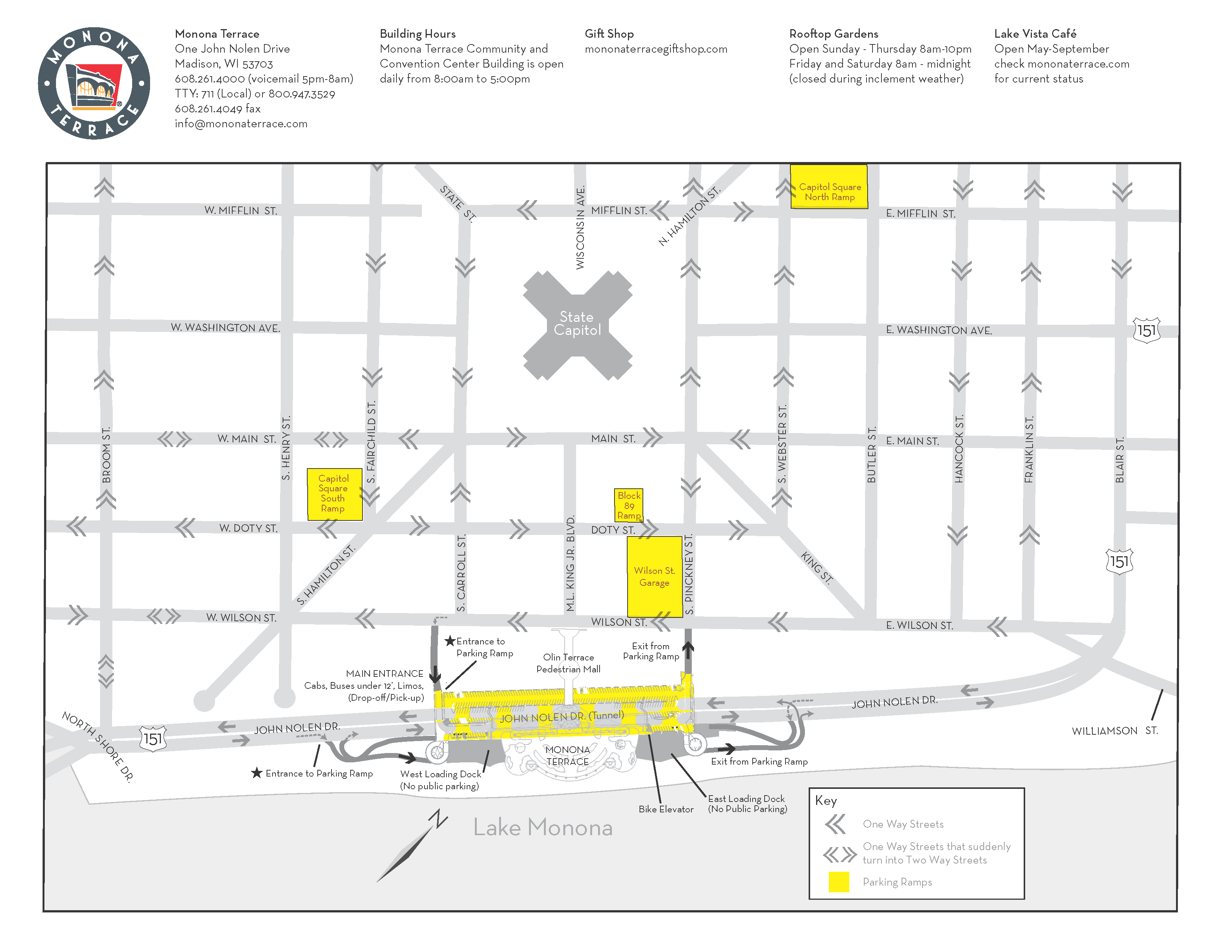 Directions to the Monona Terrace parking garage, Wilson Street Entrance: